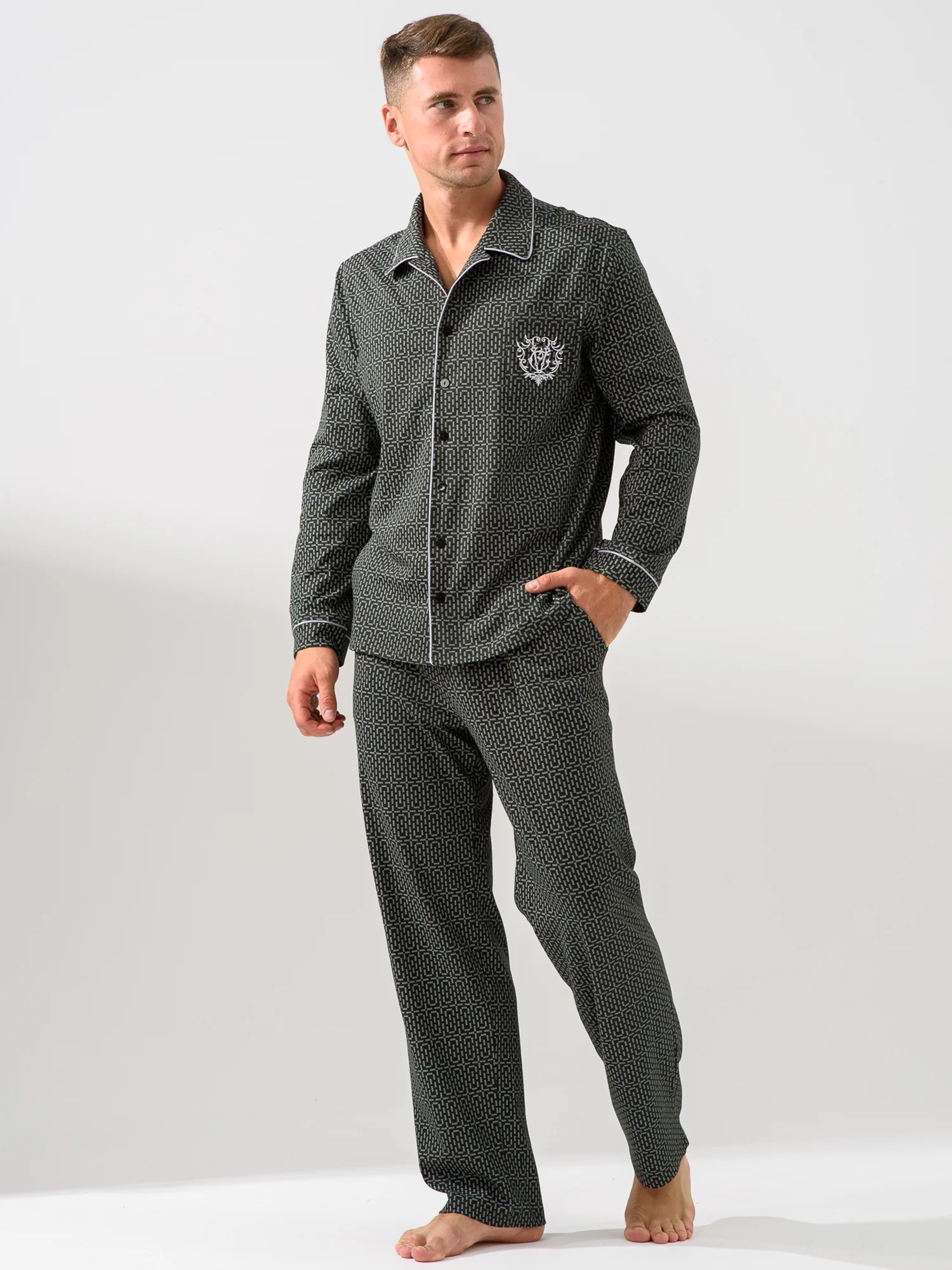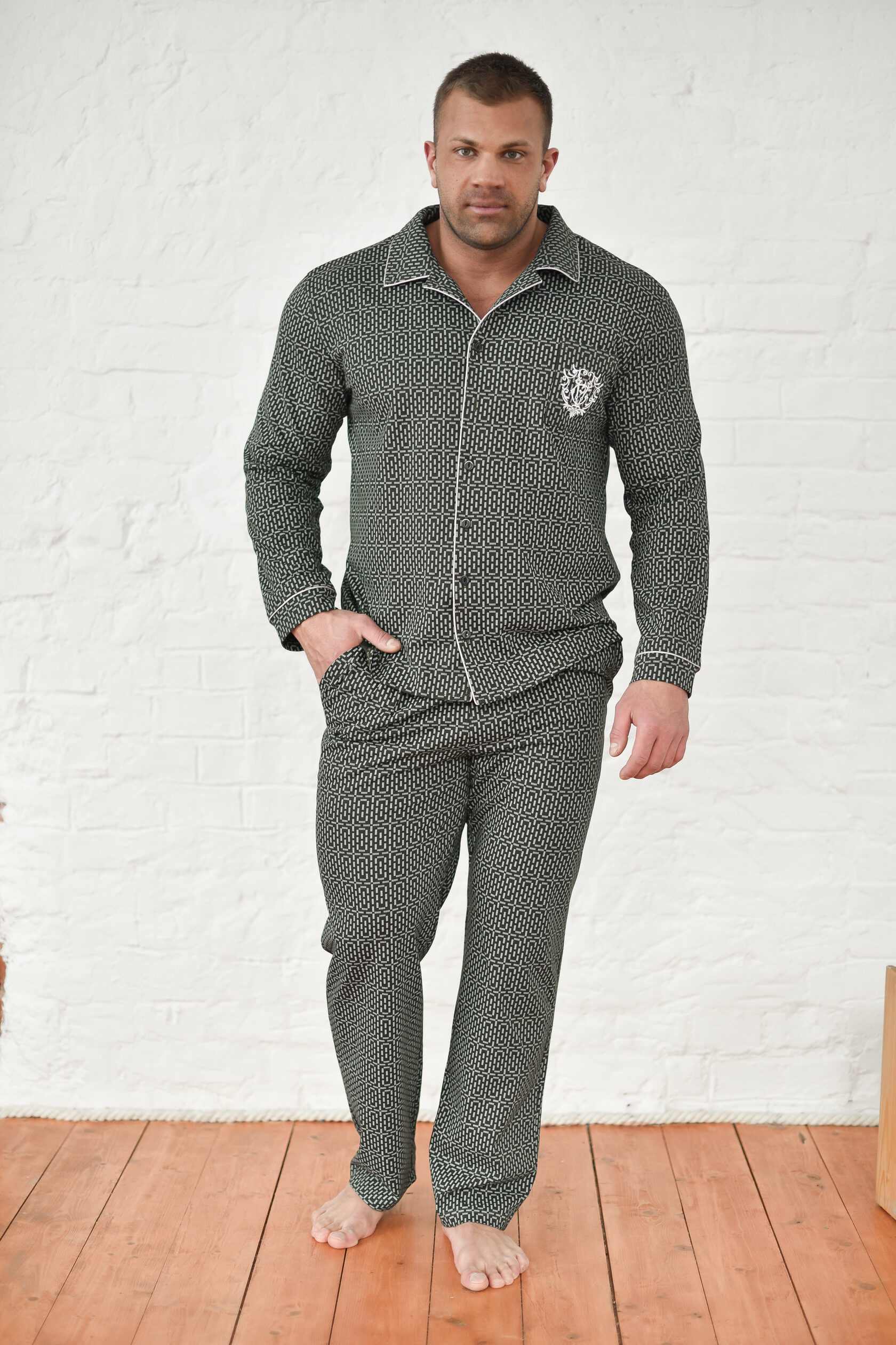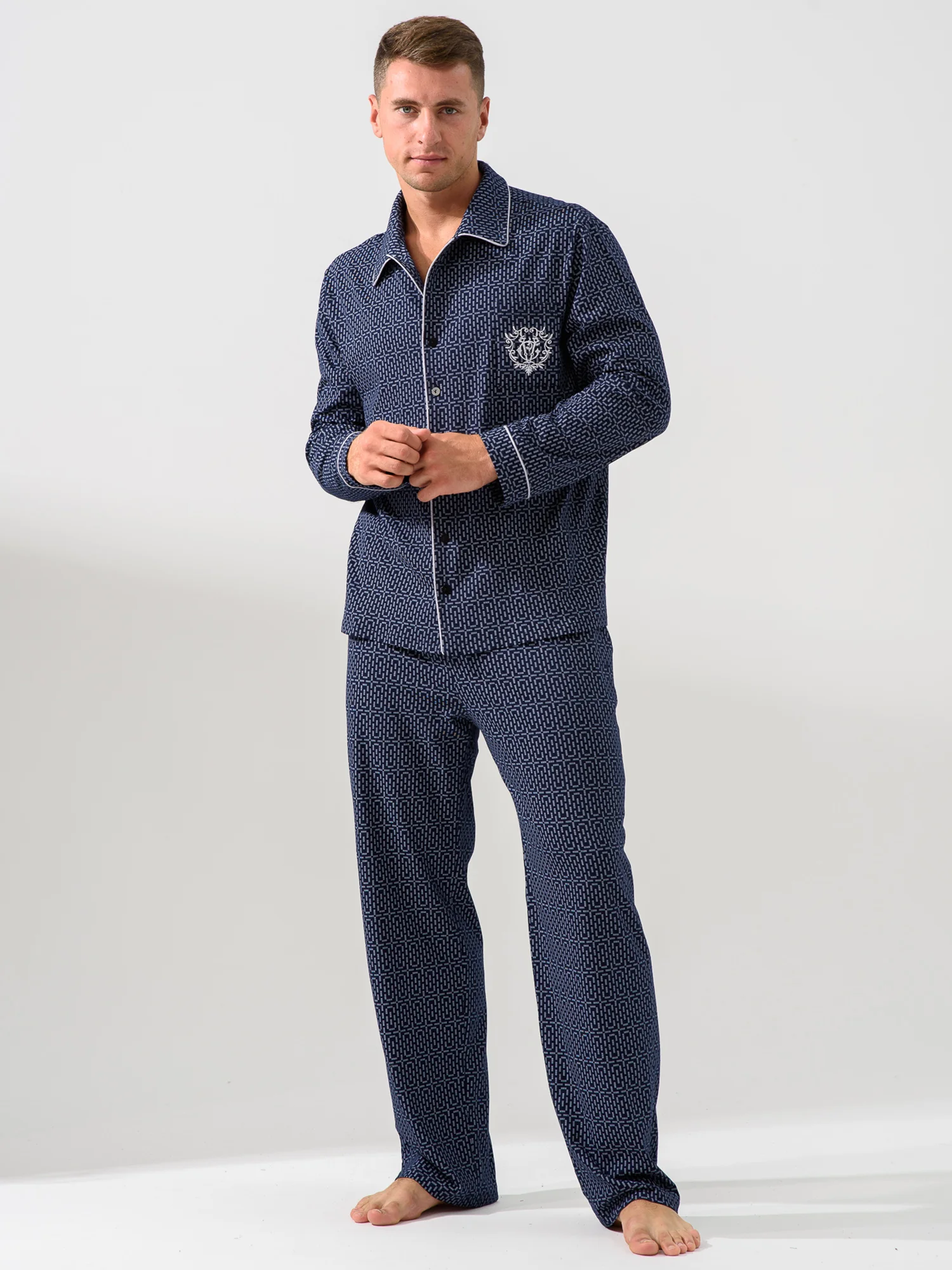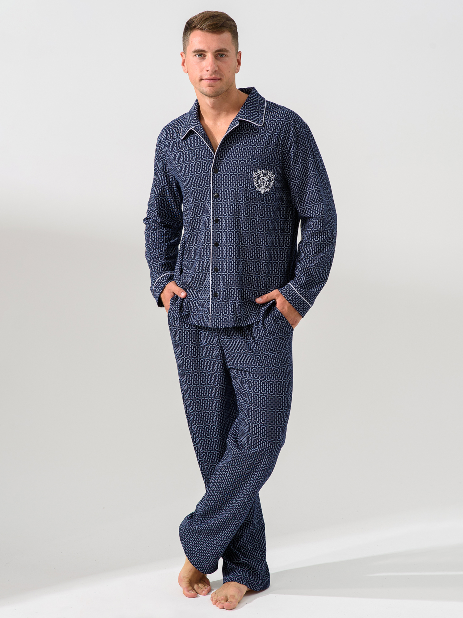 Мужская пижама — отличный выбор для домашней одежды. Удобный и функциональный наряд для мужчин разного роста и размера, крупных, худых, высоких, низких, среднего роста. Подойдет для взрослых мужчин и подростков. Комплект состоит из рубашки и брюк. Рубашка прямого кроя на пуговицах с накладным карманом и стильной вышивкой. Воротник в классическом стиле. Пижама напоминает офисный костюм. На рукавах есть манжеты, декорированные контрастным кантом. Брюки средней посадки прямого кроя с двумя глубокими и вместительными прорезными карманами по бокам. Пояс на резинке, брюки не спадают и не врезаются в живот. Свободный покрой для мужчин с животиком. Пижама сшита из 100% хлопка. Плотная ткань хорошо держит форму, не выцветает после стирок, не растягивается, не электризуется и не скатывается. Материал гипоаллергенный и не вызывает раздражение на коже. Пижама легкая и приятная на ощупь. Не сковывает движения, в такой удобно спать и делать домашние дела. Продольная полоска визуально вытягивает силуэт и скрывает недостатки фигуры. Дышащий материал пижамного комплекта позволит комфортно спать в жару и не даст замерзнуть зимними ночами. В пижаме  можно не только спать, но и ходить по дому, как в домашней одежде. В такой не стыдно даже встречать гостей. Отличный подарок для тех, кто ценит комфорт, стиль и удобство. Подарок на новый год, на 23 февраля, на день влюбленных, на день рождения, на годовщину, на рождество, на праздник. Идея наряда для пижамной вечеринки. Разрешена машинная стирка на деликатном режиме при температуре 30°C. Качество швов и отстрочка проверена службой контроля . Произведено в России.