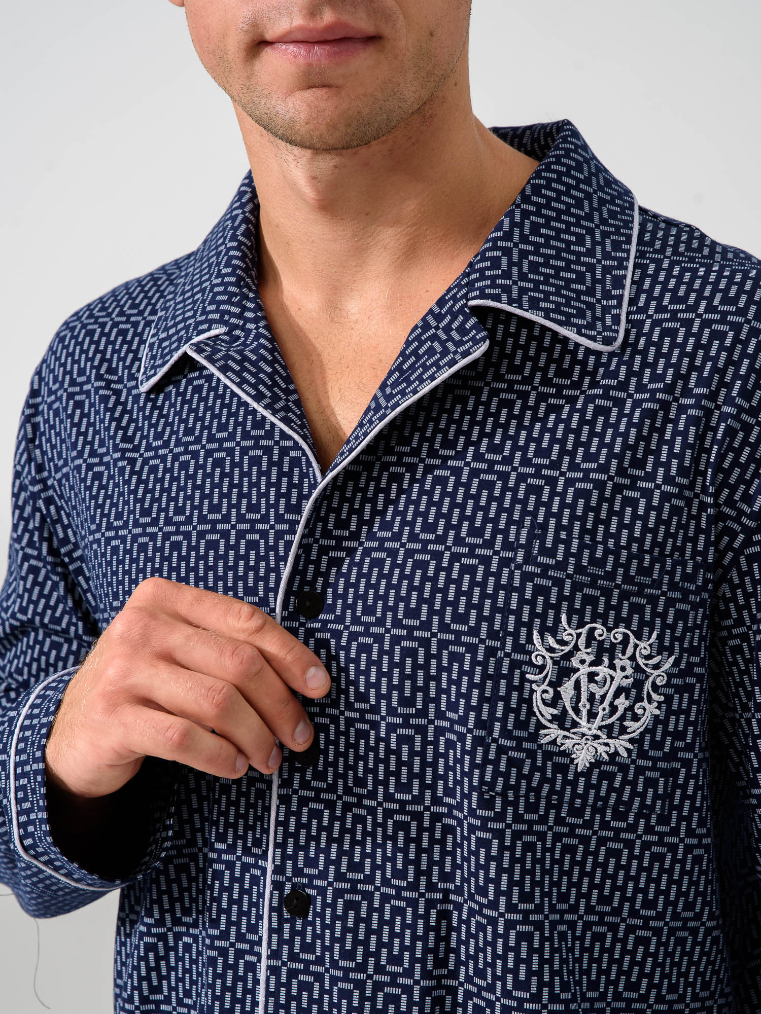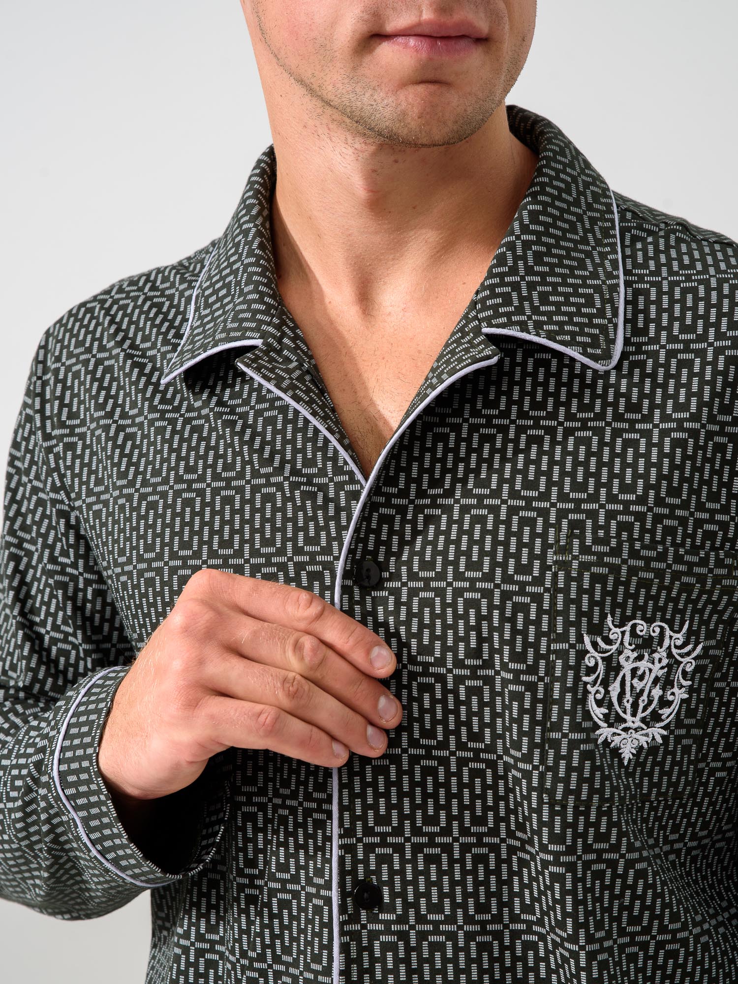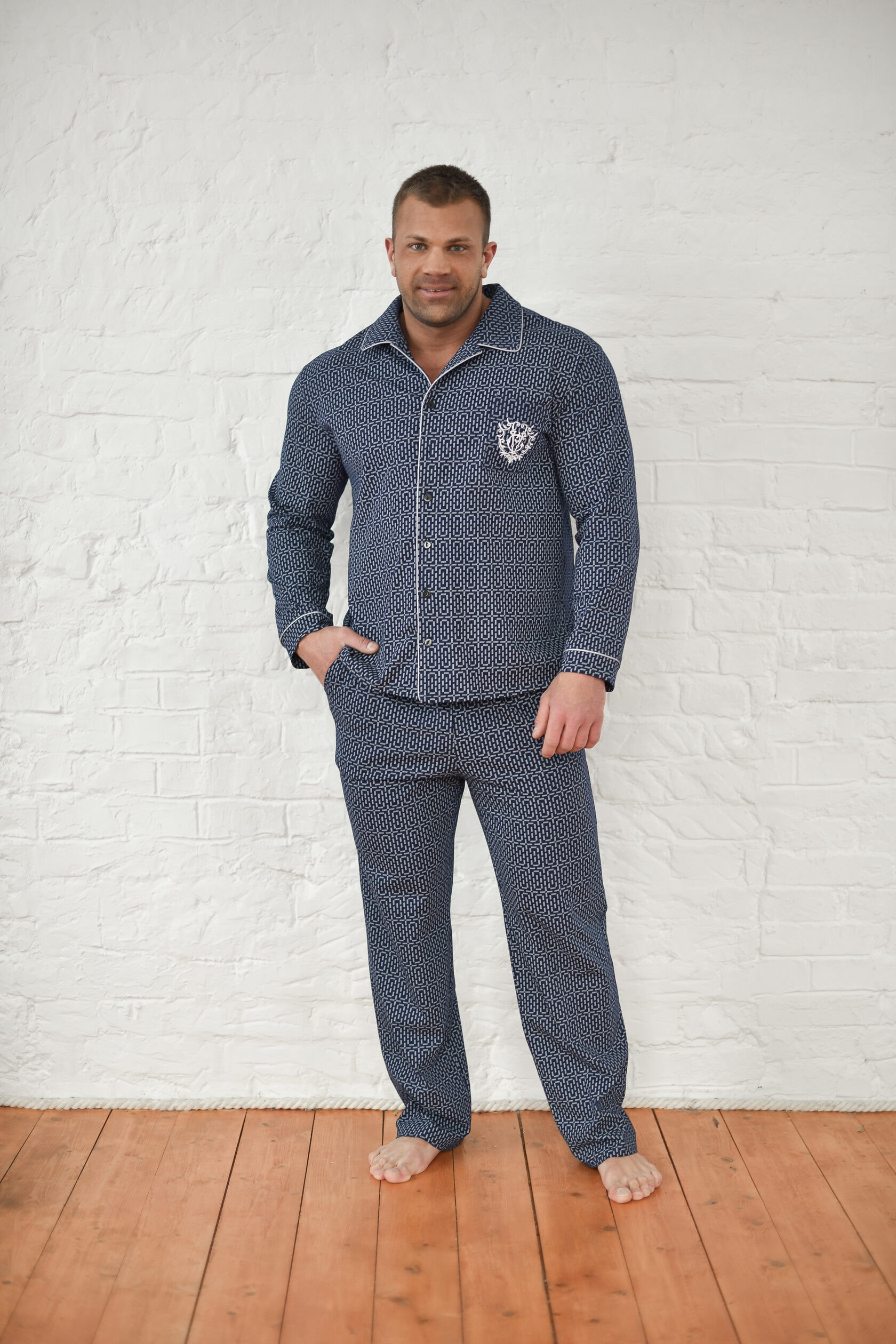 Мужская пижама — отличный выбор для домашней одежды. Удобный и функциональный наряд для мужчин разного роста и размера, крупных, худых, высоких, низких, среднего роста. Подойдет для взрослых мужчин и подростков. Комплект состоит из рубашки и брюк. Рубашка прямого кроя на пуговицах с накладным карманом и стильной вышивкой. Воротник в классическом стиле. Пижама напоминает офисный костюм. На рукавах есть манжеты, декорированные контрастным кантом. Брюки средней посадки прямого кроя с двумя глубокими и вместительными прорезными карманами по бокам. Пояс на резинке, брюки не спадают и не врезаются в живот. Свободный покрой для мужчин с животиком. Пижама сшита из 100% хлопка. Плотная ткань хорошо держит форму, не выцветает после стирок, не растягивается, не электризуется и не скатывается. Материал гипоаллергенный и не вызывает раздражение на коже. Пижама легкая и приятная на ощупь. Не сковывает движения, в такой удобно спать и делать домашние дела. Продольная полоска визуально вытягивает силуэт и скрывает недостатки фигуры. Дышащий материал пижамного комплекта позволит комфортно спать в жару и не даст замерзнуть зимними ночами. В пижаме  можно не только спать, но и ходить по дому, как в домашней одежде. В такой не стыдно даже встречать гостей. Отличный подарок для тех, кто ценит комфорт, стиль и удобство. Подарок на новый год, на 23 февраля, на день влюбленных, на день рождения, на годовщину, на рождество, на праздник. Идея наряда для пижамной вечеринки. Разрешена машинная стирка на деликатном режиме при температуре 30°C. Качество швов и отстрочка проверена службой контроля . Произведено в России.