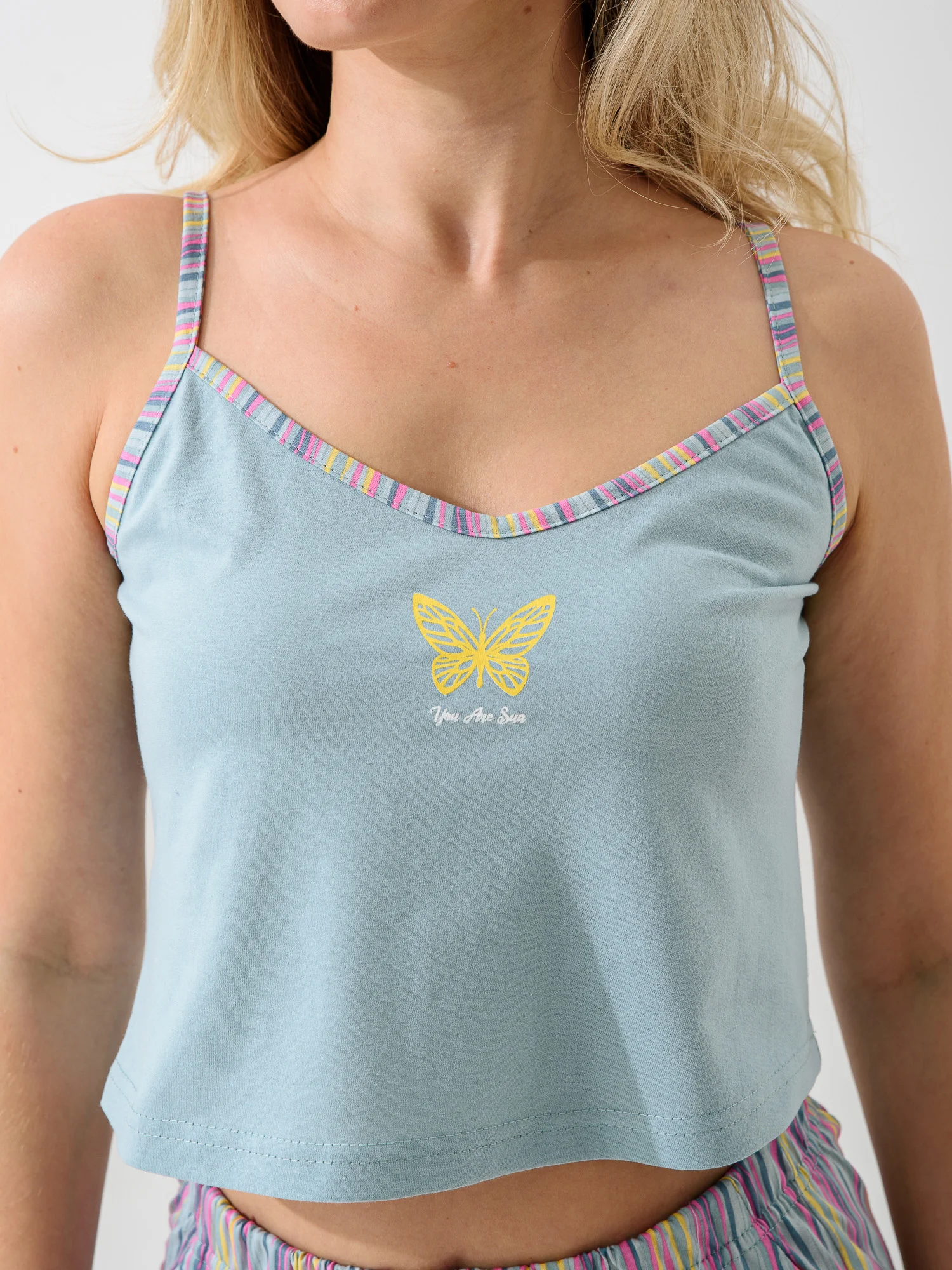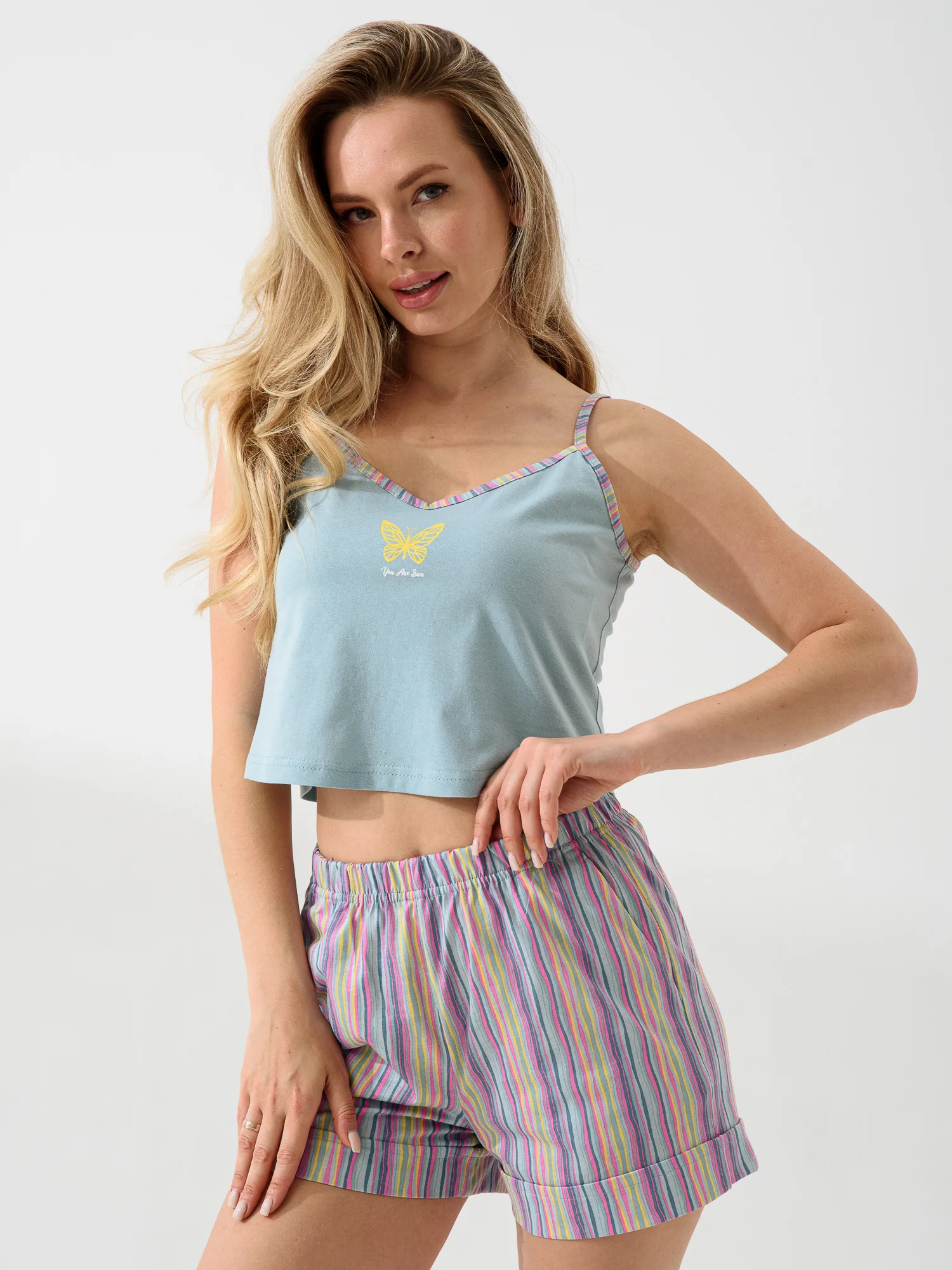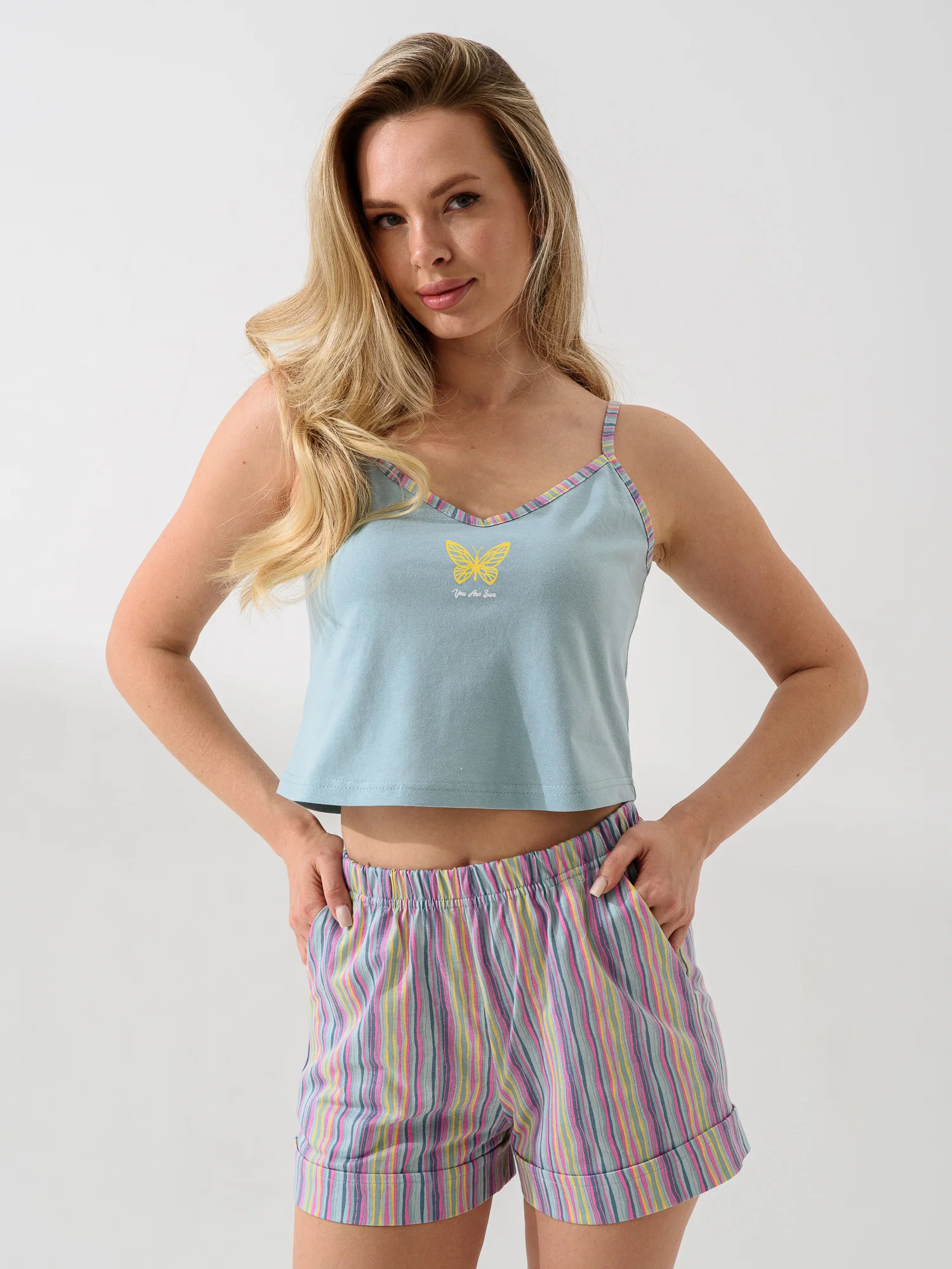 Женская пижама «Солнечная» от бренда ОПТИМА ТРИКОТАЖ — это комфорт и уют дома! Шорты и топ из мягкого хлопка 100%-го качества обеспечат свободу движений и приятную прохладу благодаря натуральному составу. Продукция российского производителя гарантирует отличное качество изделия. Мягкий голубой оттенок создаст атмосферу спокойствия и гармонии в вашем доме. Наслаждайтесь комфортным отдыхом каждую ночь!