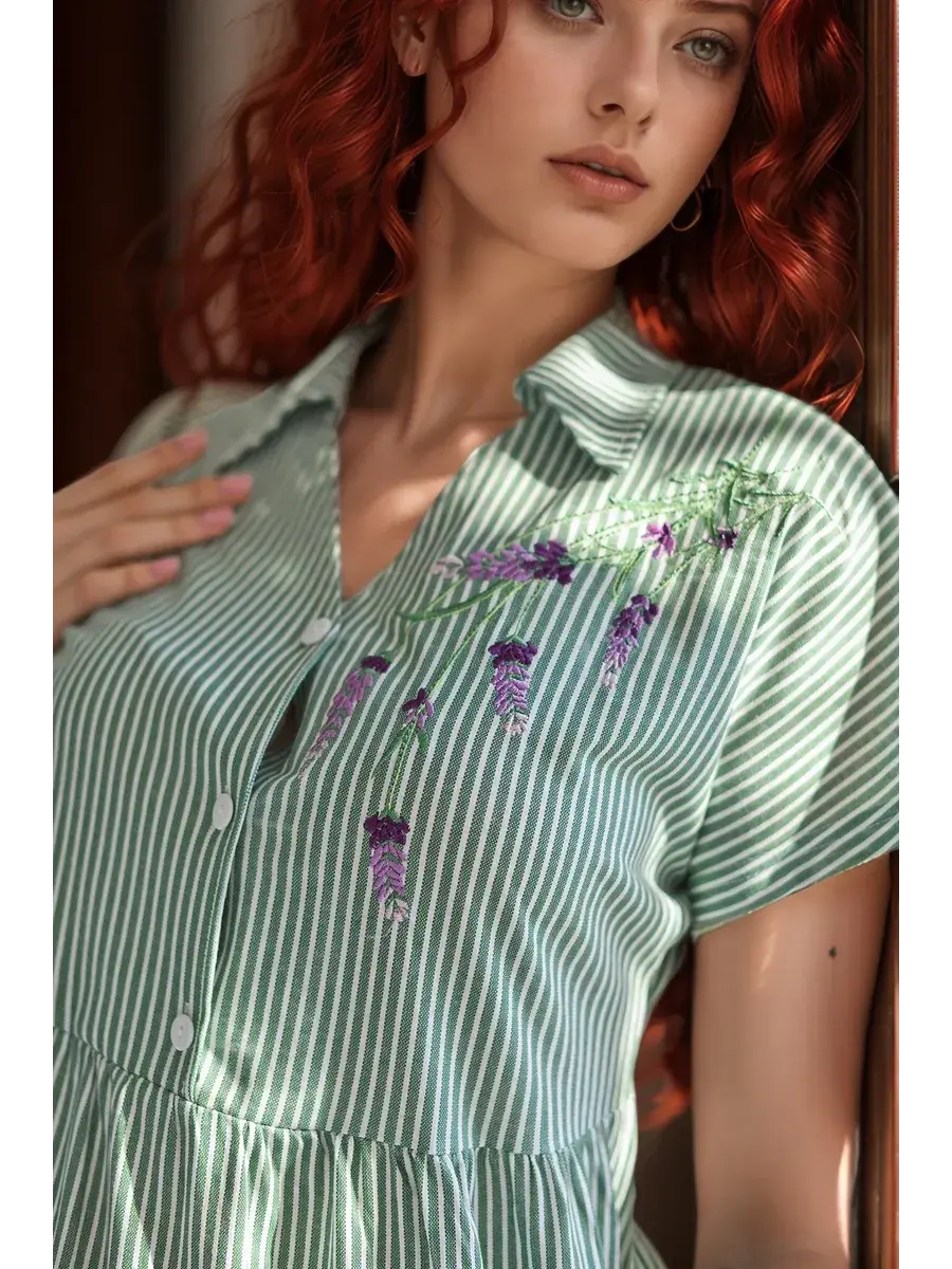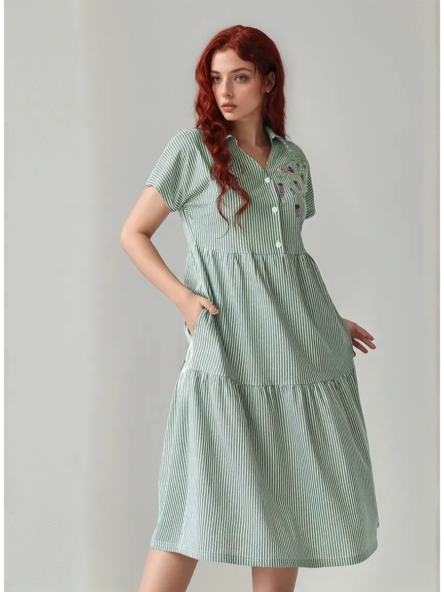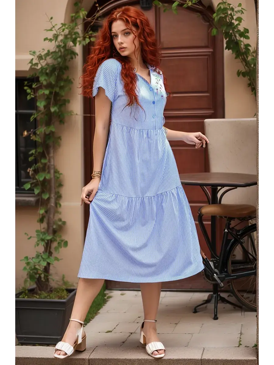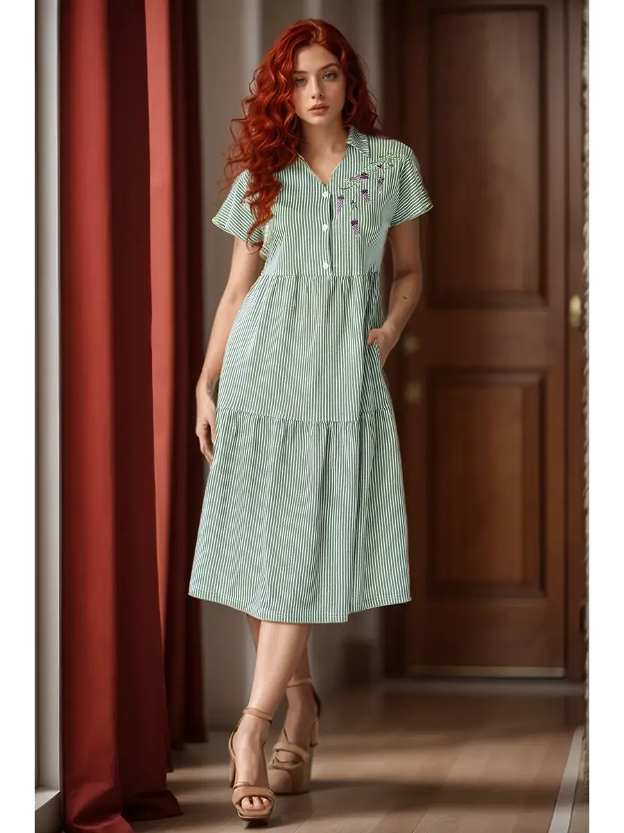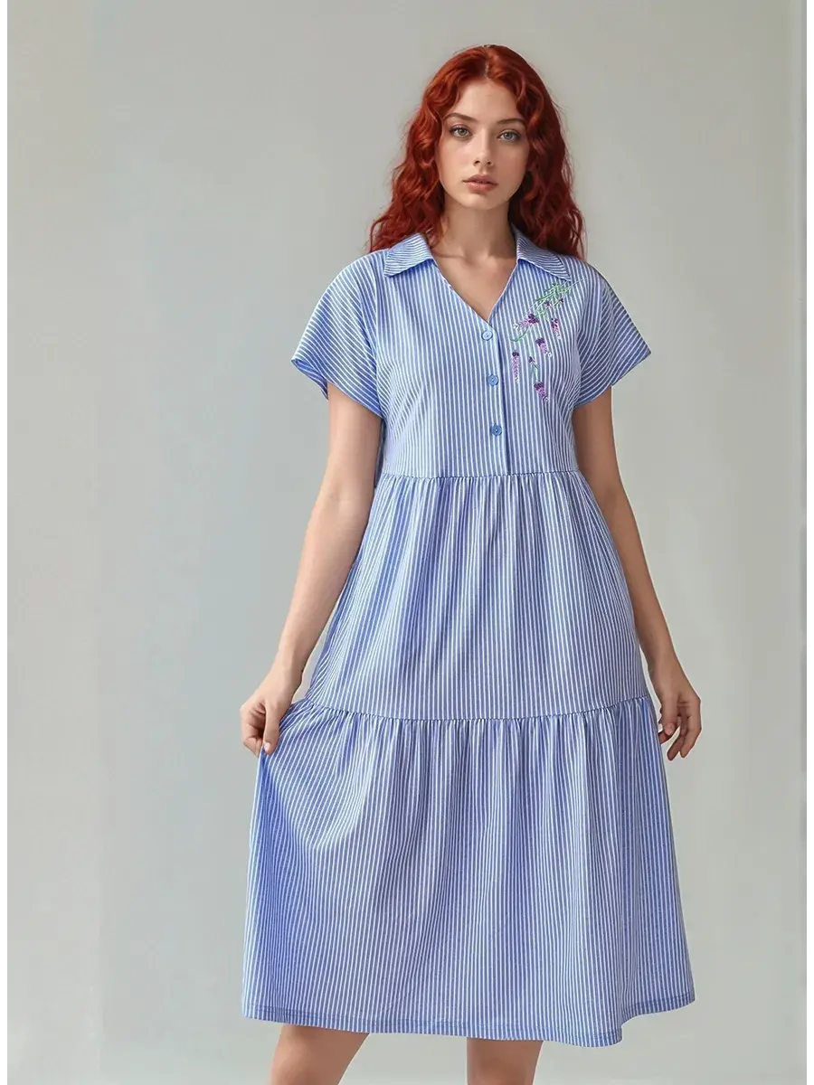 Платье женское из набивного трикотажного х/б полотна. Изделие А-образного силуэта, длиной ниже линии колена. Изделие отрезное с завышенной линией талии и по линии бёдер. Платье с V- образной  формой горловины и отложным воротником с острыми концами, со спущенным цельнокроенным рукавом и застёжкой на петли пуговицы по линии борта. На полочке с левой стороны вышивка. В боковых швах обработаны карманы с фигурной линией входа.