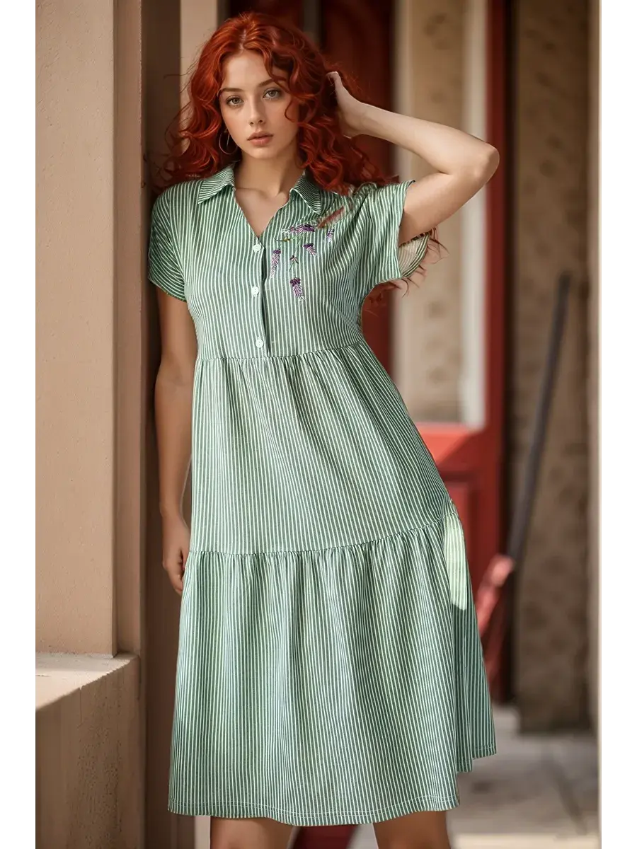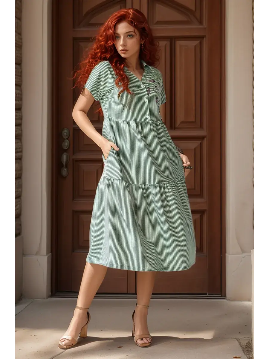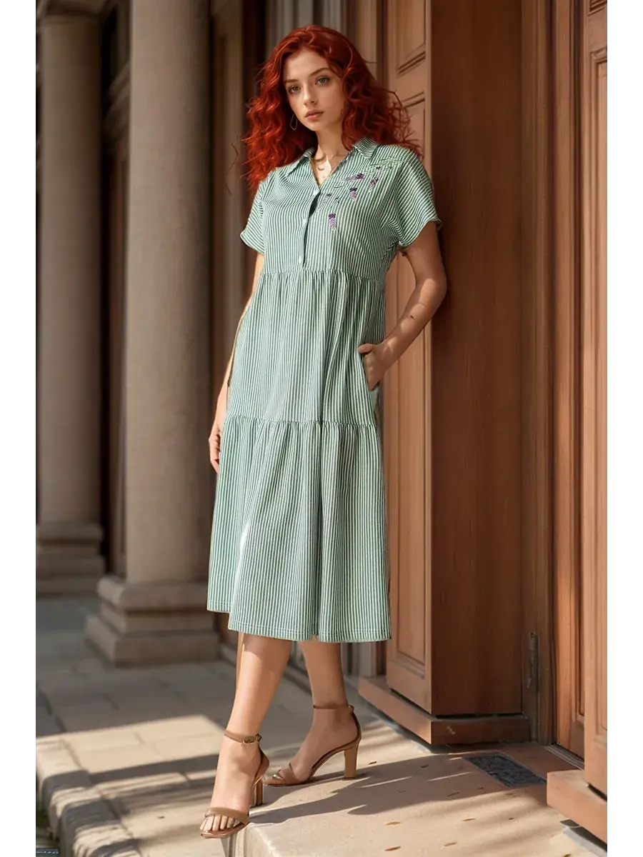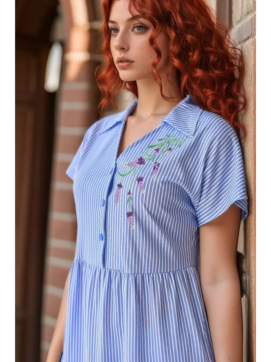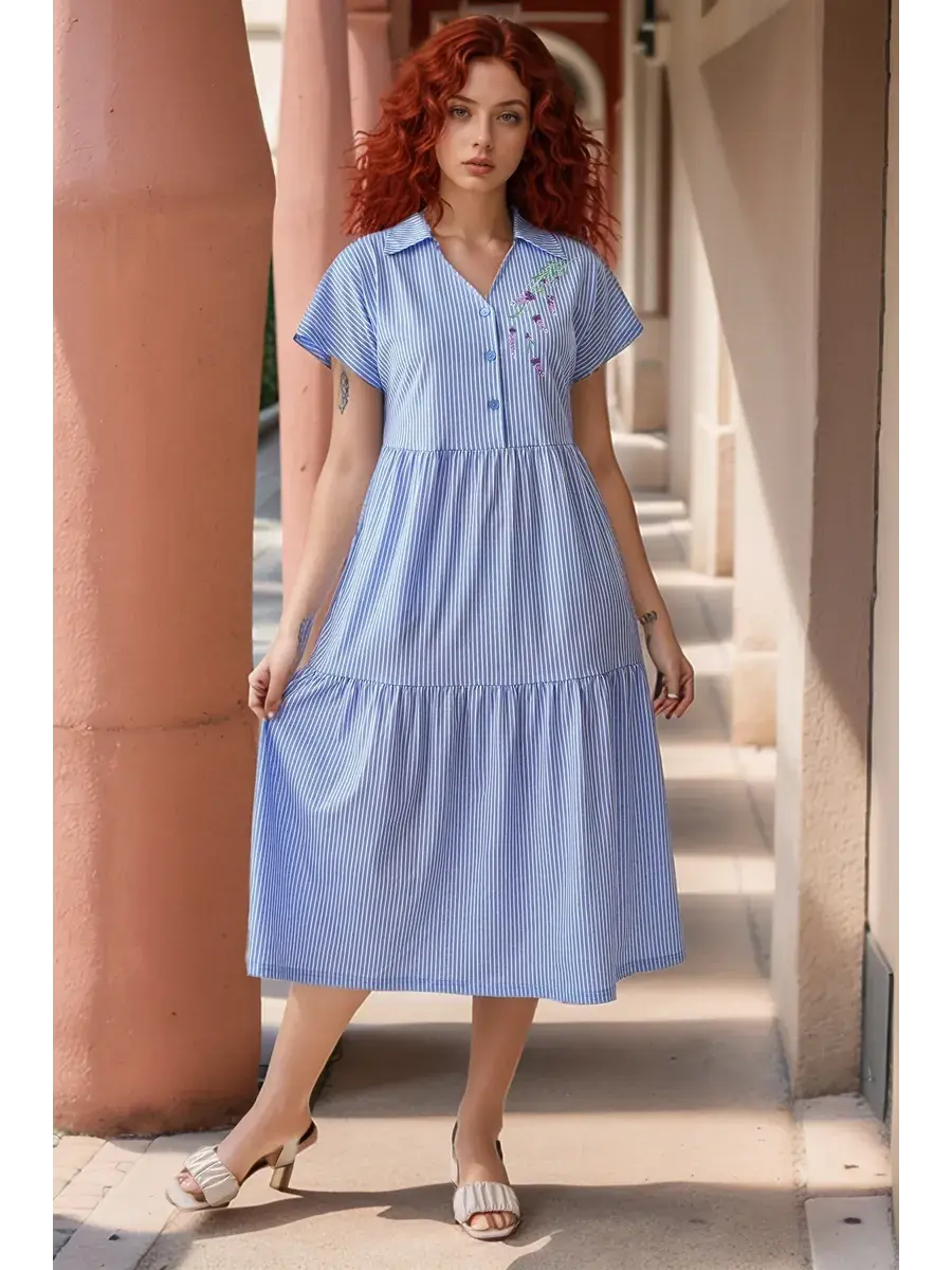 Платье женское из набивного трикотажного х/б полотна. Изделие А-образного силуэта, длиной ниже линии колена. Изделие отрезное с завышенной линией талии и по линии бёдер. Платье с V- образной  формой горловины и отложным воротником с острыми концами, со спущенным цельнокроенным рукавом и застёжкой на петли пуговицы по линии борта. На полочке с левой стороны вышивка. В боковых швах обработаны карманы с фигурной линией входа.