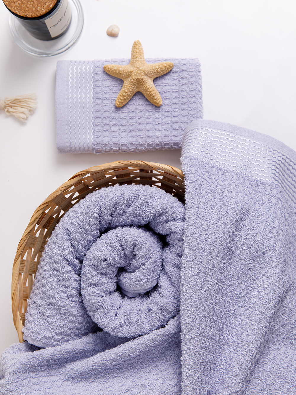 Полотенце махровое жаккардовое с минималистичным ячеистым рисунком в структуре махры и бордюром с добавлением вискозной нити. Махровый ворс из однониточной пряжи. Размер 33х50 см (+/- 2 см). Модель представлена в 4-х пастельных оттенках и трех размерах.