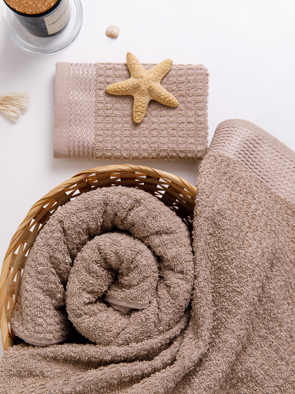 Полотенце махровое жаккардовое с минималистичным ячеистым рисунком в структуре махры и бордюром с добавлением вискозной нити. Махровый ворс из однониточной пряжи. Размер 33х50 см (+/- 2 см). Модель представлена в 4-х пастельных оттенках и трех размерах.