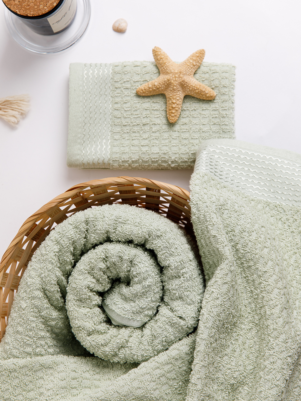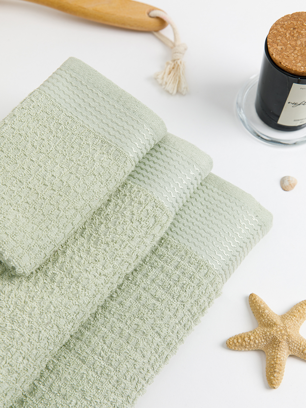 Полотенце махровое жаккардовое с минималистичным ячеистым рисунком в структуре махры и бордюром с добавлением вискозной нити. Махровый ворс из однониточной пряжи. Размер 50х85 см (+/- 2 см). Модель представлена в 4-х пастельных оттенках и трех размерах.